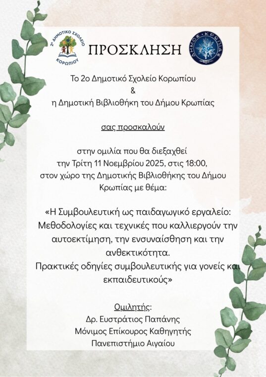 Το 2ο Δημοτικό Σχολείο Κορωπίου σε συνεργασία με την Δημοτική Βιβλιοθήκη Κορωπίου, με χαρά θα φιλοξενήσουν τον Δρ. Ευστράτιο Παπάνη, Μόνιμο Επίκουρο Καθηγητή Πανεπιστημίου Αιγαίου, σε μία ενδιαφέρουσα ομιλία, την