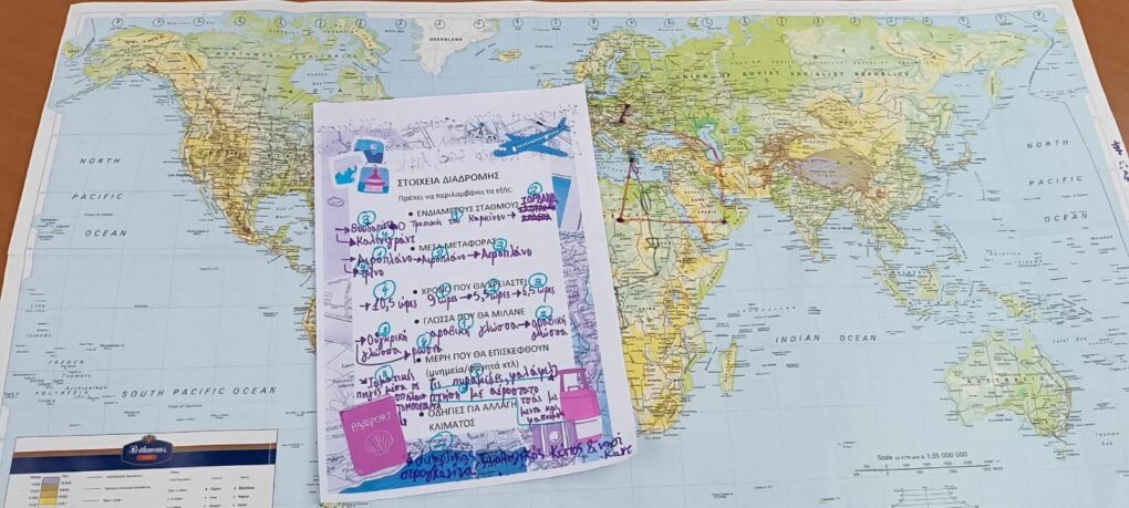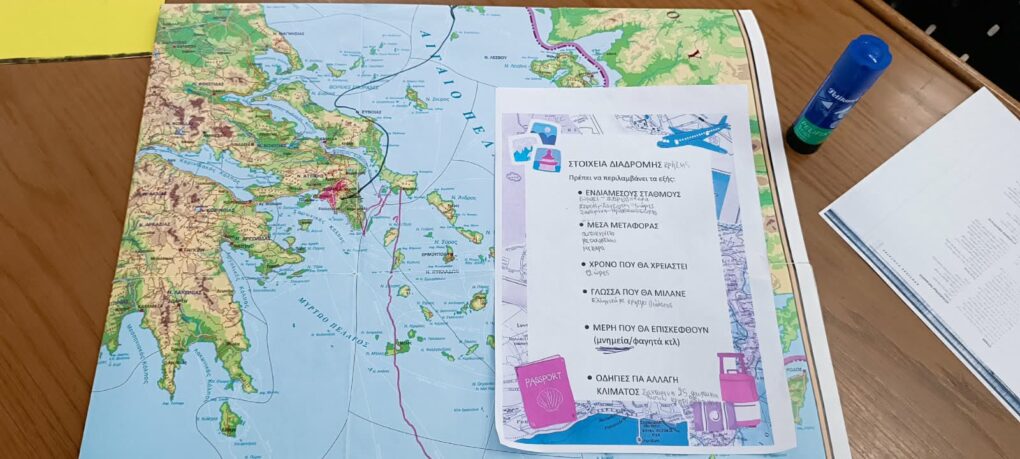 Ψάξαμε σε χάρτες, άτλαντες, βιβλία και ταξιδιωτικούς οδηγούς και βρήκαμε όλα τα στοιχεία για το ταξίδι μας : Την πορεία που θα ακολουθήσουμε, τα μεταφορικά μέσα που θα χρησιμοποιήσουμε, τους ενδιάμεσους σταθμούς, τον χρόνο του ταξιδιού, τα μέρη και τα μνημεία που θα επισκεφτούμε, τα φαγητά, τη γλώσσα, την μουσική, τους χορούς, την αλλαγή κλίματος κλπ. Μετά κάθε ομάδα διηγήθηκε στην άλλη το συναρπαστικό της ταξίδι!